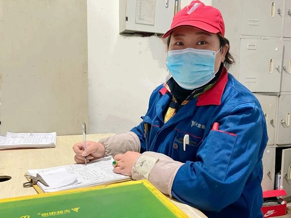 眼前的蓝色身影正埋首在操作台前对出厂前的电池进行“例行检查”,她细细观察,随后在表格上记录下电池的各项数据,不时倾斜身子指导身边的同事。